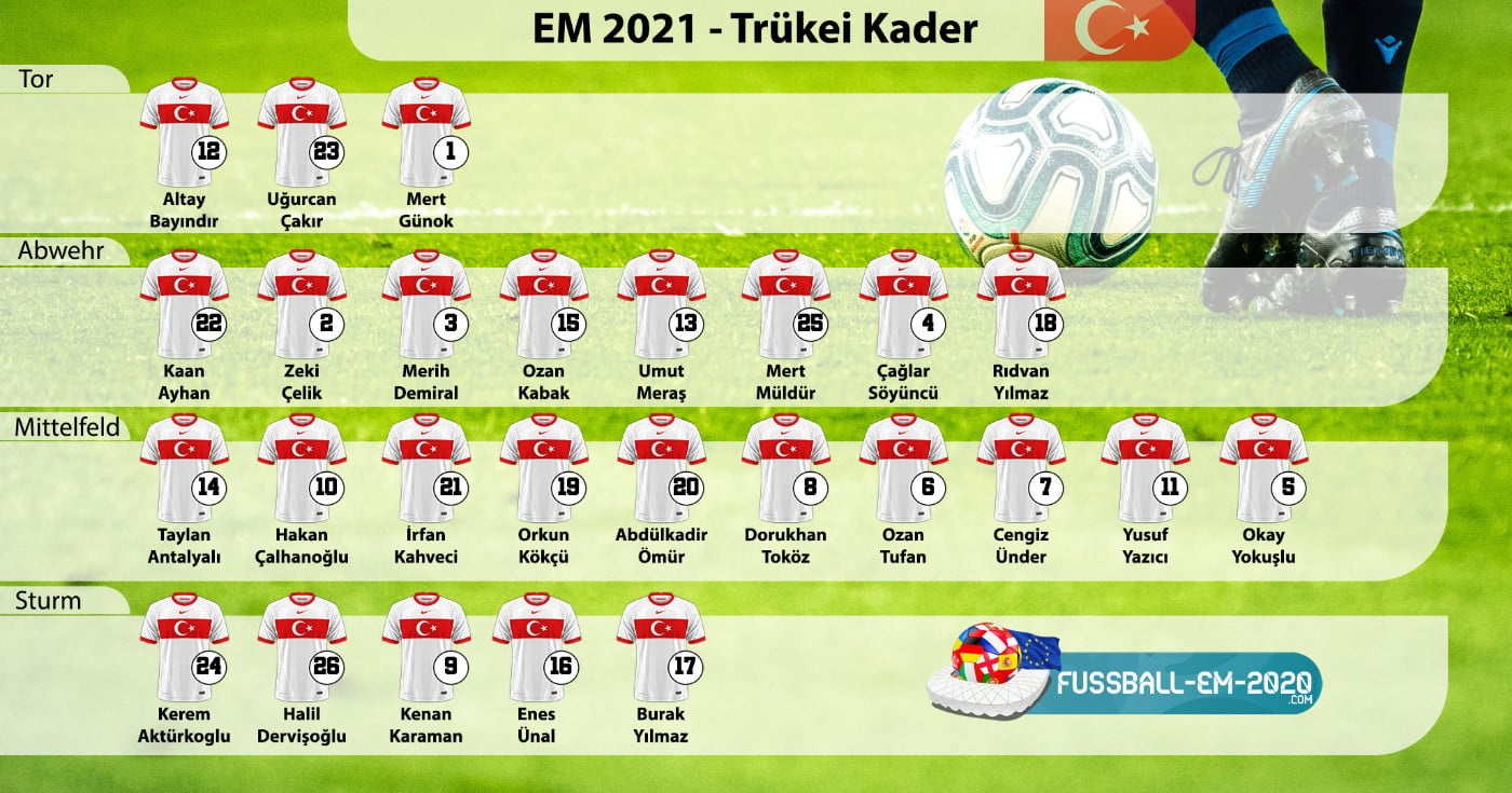 ABWEHR: Zeki Celik (OSC Lille), Mert Müldür (US Sassuolo), Merih Demiral (Juventus Turin), Ozan Kabak (FC Liverpool), Caglar Söyüncü (Leicester City), Kaan Ayhan (US Sassuolo), Umut Meras (AC Le Havre), Ridvan Yilmaz (Besiktas)